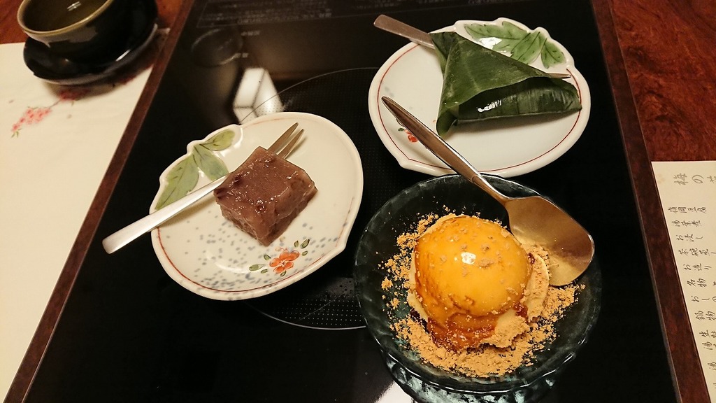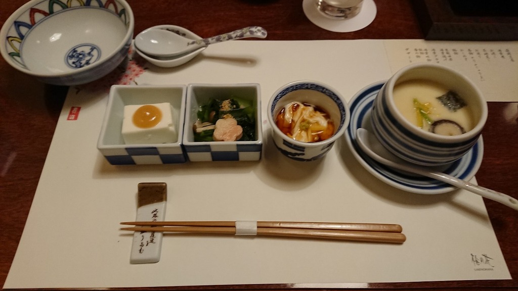 左から嶺岡豆腐、お浸し、湯葉煮、茶碗蒸しです♬