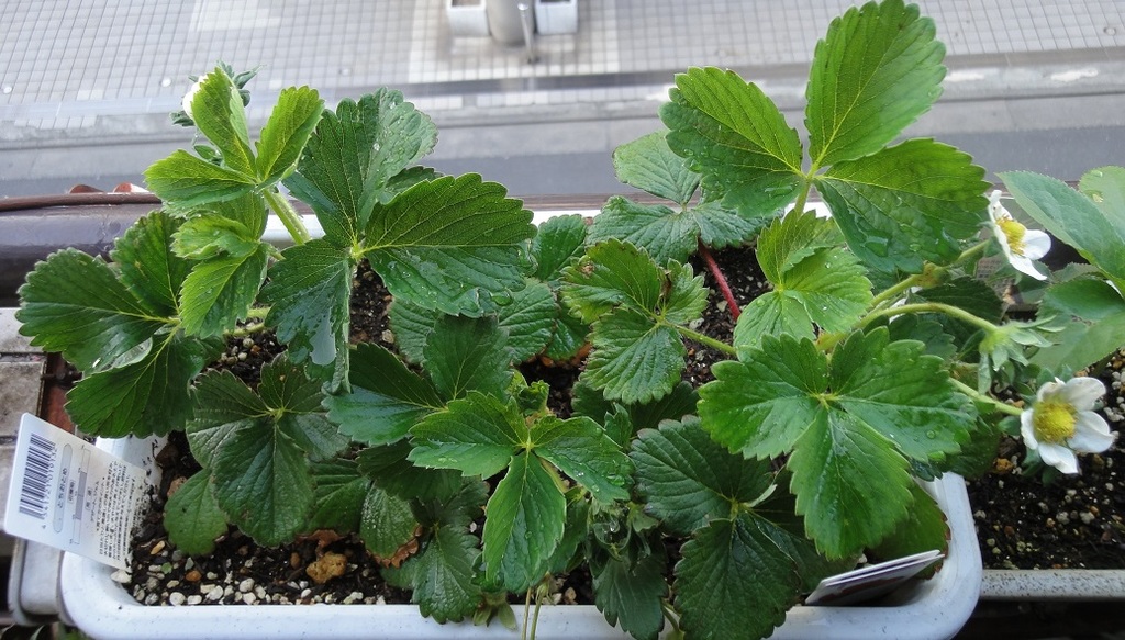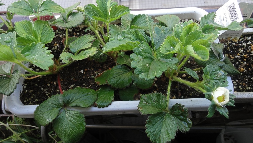 ポッドの左右両端にイチゴの花も咲きだしたヾ(๑╹ヮ╹๑)ノ”