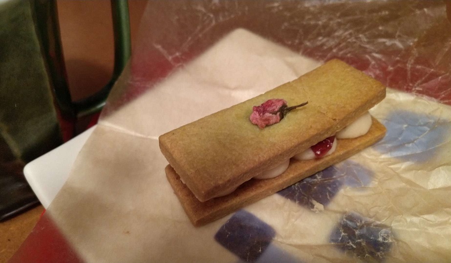 紅茶?テイストのクッキーに桜のジャムとバタークリームが挟んであって