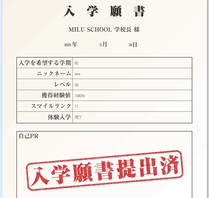 ミルスクのデールに報告した後、公式HPのミルスク入学願書に自己PRを