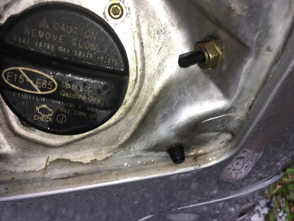 給油口の裏を見た写真。奥の辺りで水が垂れてるのわかる??