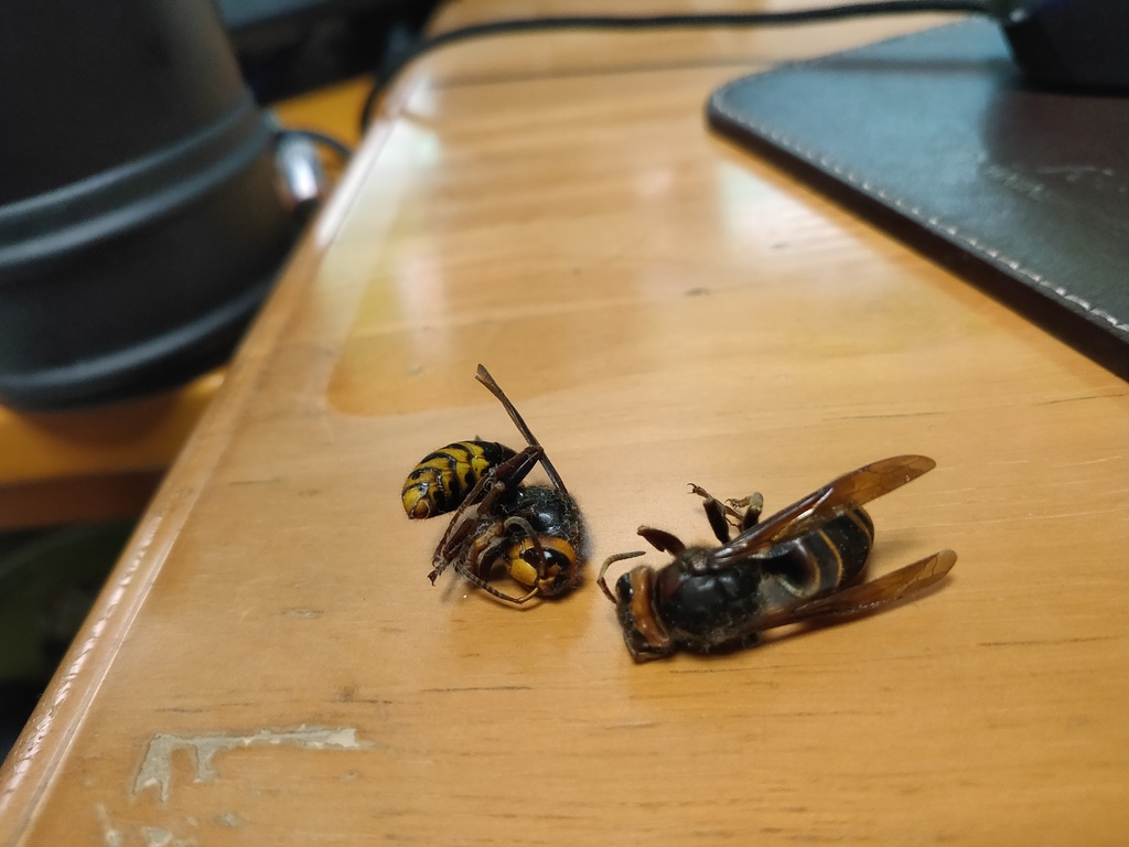 部屋に侵入していた5匹のうち外へ出て行った1匹以外の4匹は 乾燥してお亡くなりに。。。黄色スズメバチですね。
