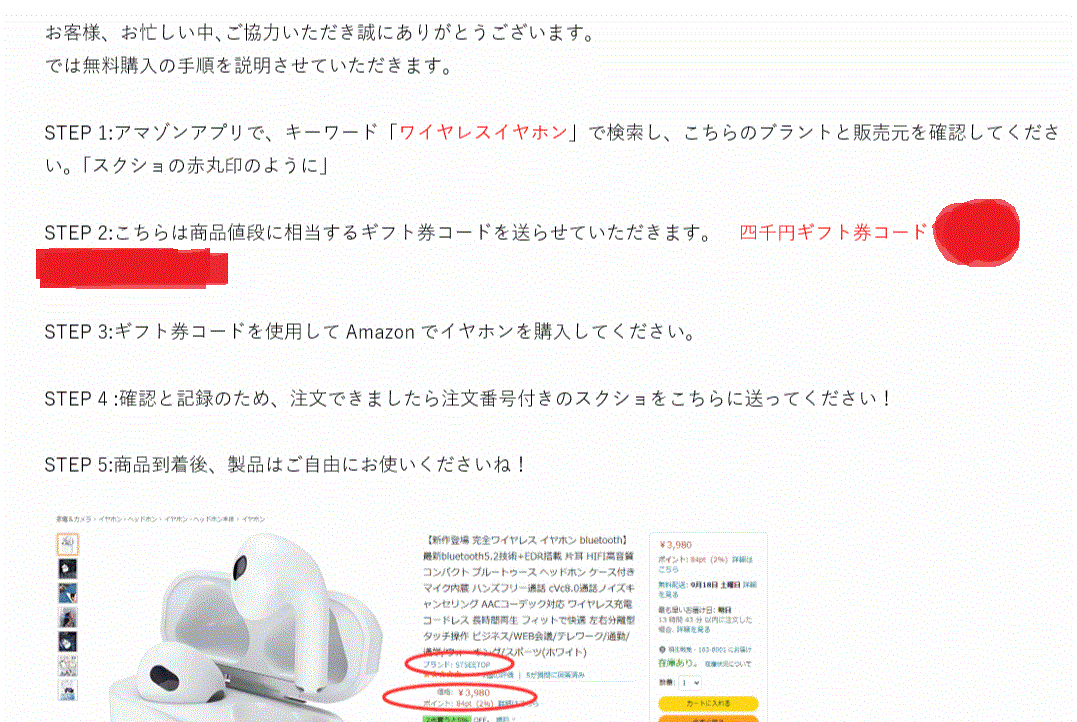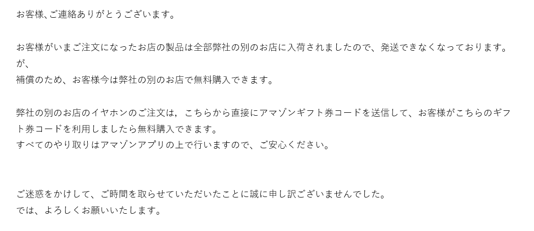 「アマゾンの倉庫に全部送っちゃったからこっちから送れないのでクーポン渡すから代わりにアマゾン倉庫から発送のヤツ買って」って内容で