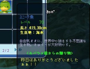 カッパちゃん、ありがとー^^ ヾ(o´∀`o)ノワァーィ♪ ユニ魚とランダム魚楽しんでねー^^ (*´▽`*)