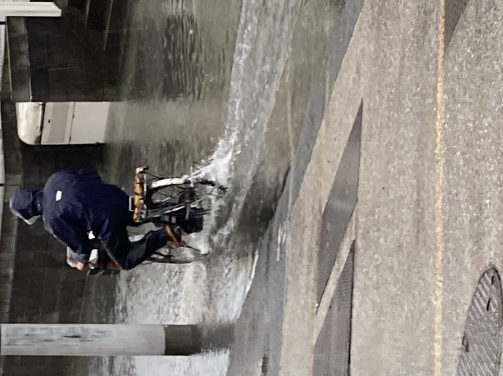 午後あたりから風雨が強まってきてます。 お昼前後の家周辺。この時はまだくるぶし上ぐらい。 現在はふくらはぎから膝下あたりです。風がーw
