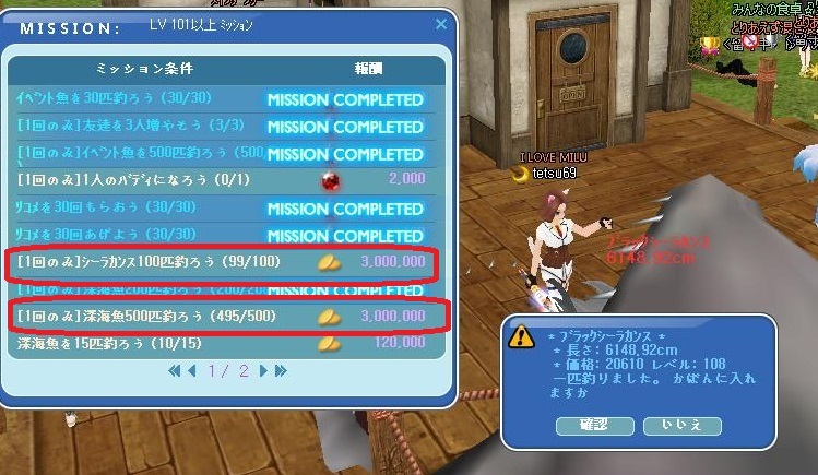 昨日、レベル101~の1回のみミッションの、シーラカンス100匹&深海魚500匹達成しましたぁ~!!