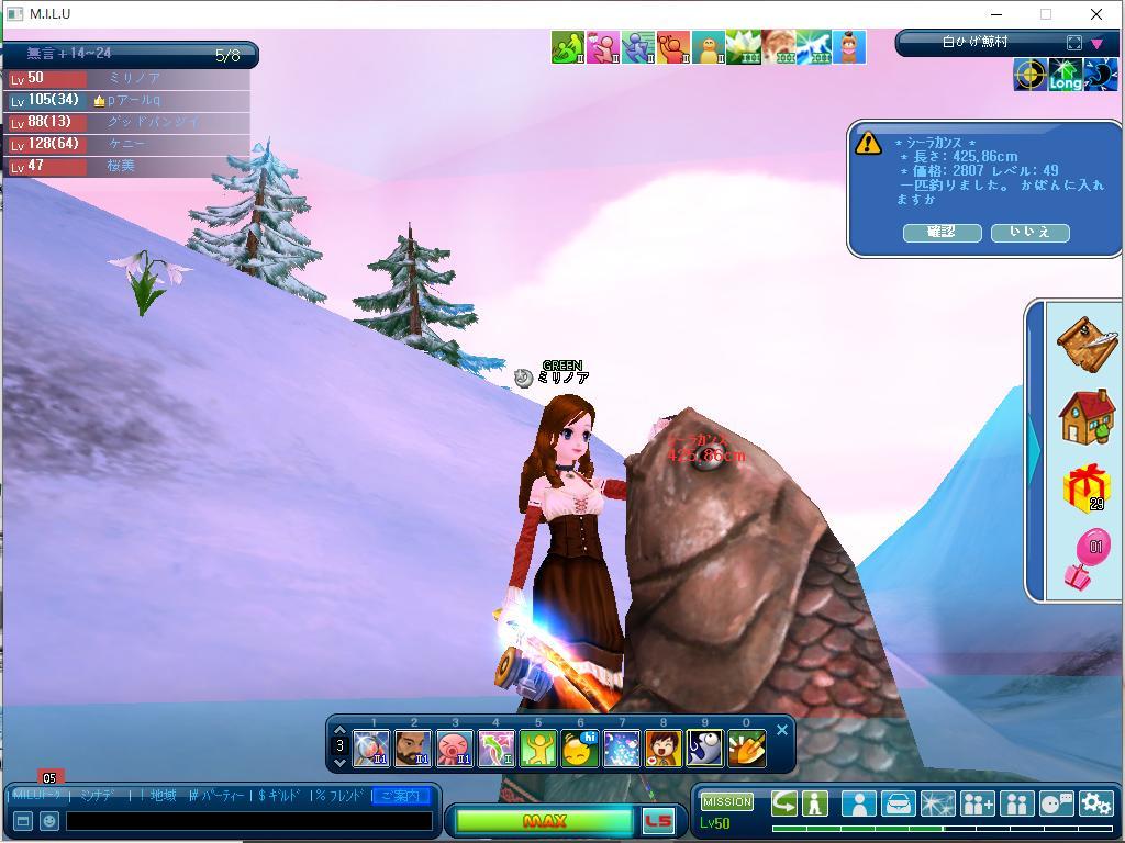今日は朝お街に行って、珈琲店にはいってから、デパートにいきました。コート見に行ったけどなかったです。さて、お風呂に入りMILUにIN. じっくりたっぷりがんばりましたよーw イベ釣り30&おさかな20匹。シーラカンスも釣りました。しかーし、しーらの精密は男性用コスチューム生地でした。いらーん。