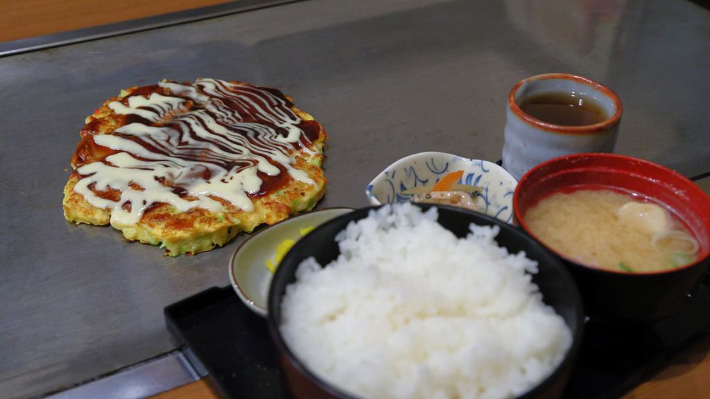 まずは大阪で昼食。お好み焼き定食。 関西風のお好み焼きって、ボウルに材料が入った状態でやってきて、自分でまぜまぜしてから鉄板で焼くんだと思ってました。が、少なくともこの店では焼いた状態で運ばれてきました。 自分で焼いてみたかったのでちょっと残念。