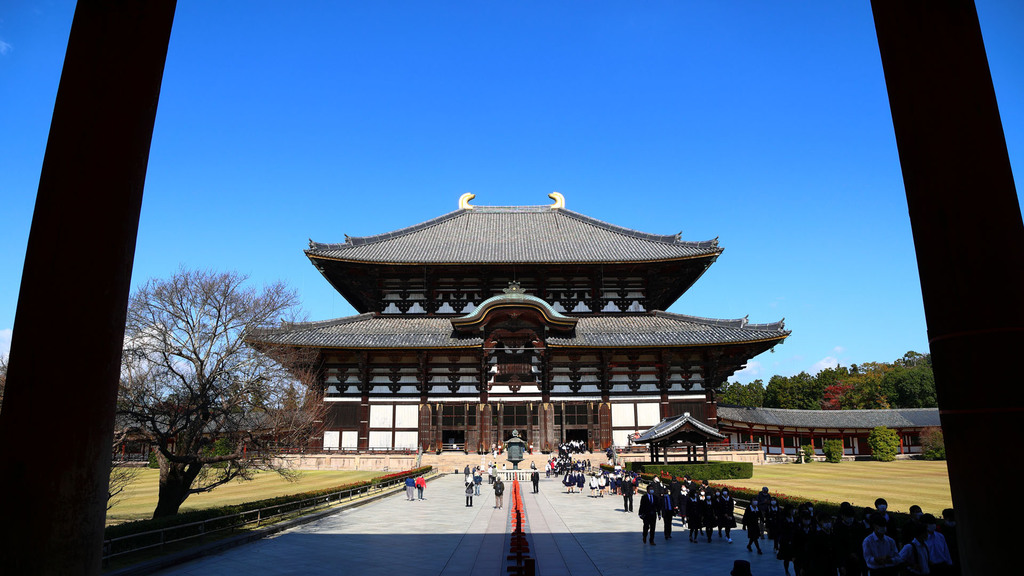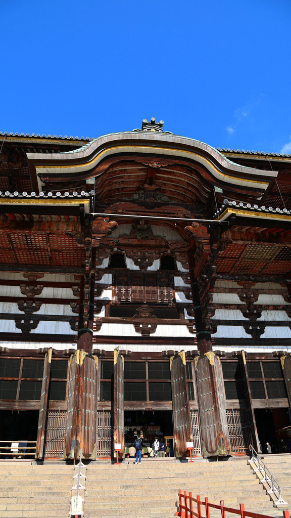 東大寺正面。画像中央辺りに扉がついているのだけど、そこを開けると、上の画像の位置辺りから見たときに大仏様のお顔が見えるらしい。