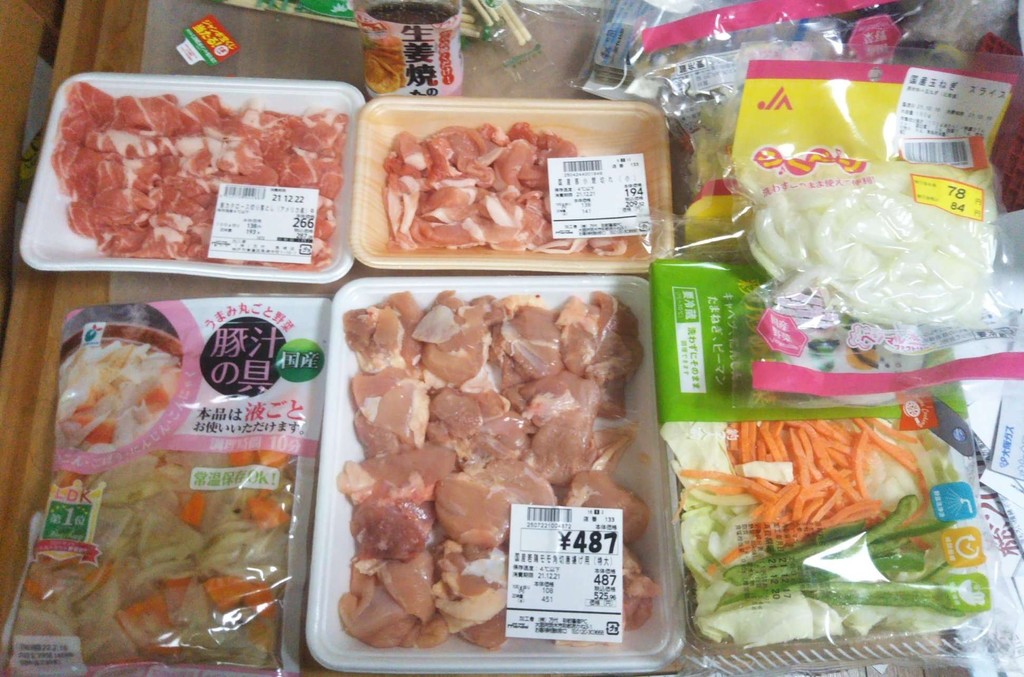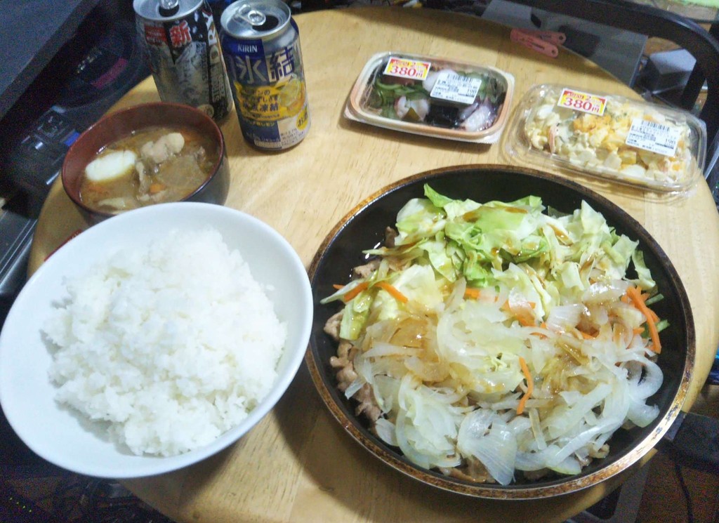 豚と野菜の生姜焼き炒め + 豚汁具材の鶏の味噌汁 + どんぶり白ごはん