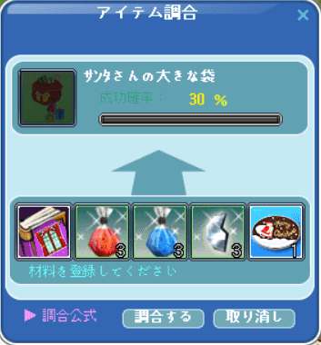 | 調合成功おめでとぉ♪(o'ー'o)b 来年はサンタなサンタナさんのそのでっかい袋からプレゼント届くのかなぁ?w |