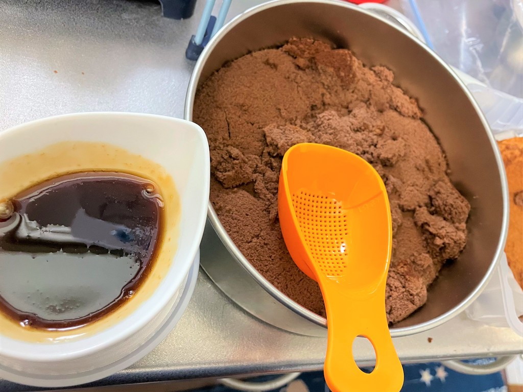 土台になるスポンジケーキとコーヒー、表面に振るココア。