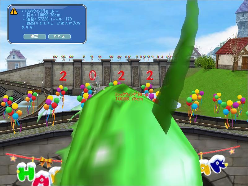 正月仕様に飾られた橋の上で 深海魚を釣り上げて