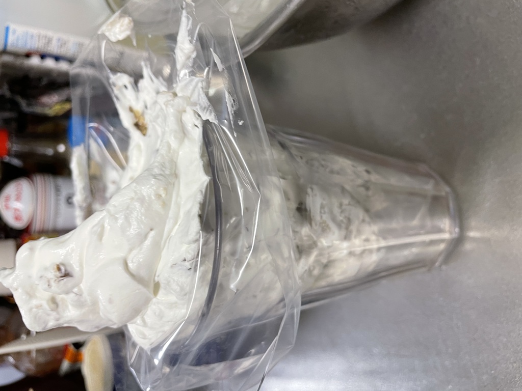 大きめのコップに袋をかぶせ、クリーム注いで冷やします。