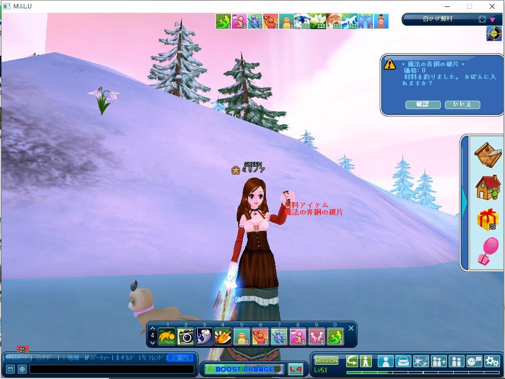 いや・・深い意味はないのですが・・・。 MILUで、イベ釣り10やって、イベ服でないかなー。と、期待してたんですが、でませんでした。そして材料釣り。青銅の破片ばかり釣っていました。