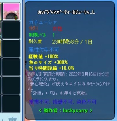 この属性で修繕可とは、とってもお得^^ 家具コレブを完成させるのは大変だったけど 高属性の修繕可カチュになったから良しとします^^ エモ「夢心地」はこんな感じ^^