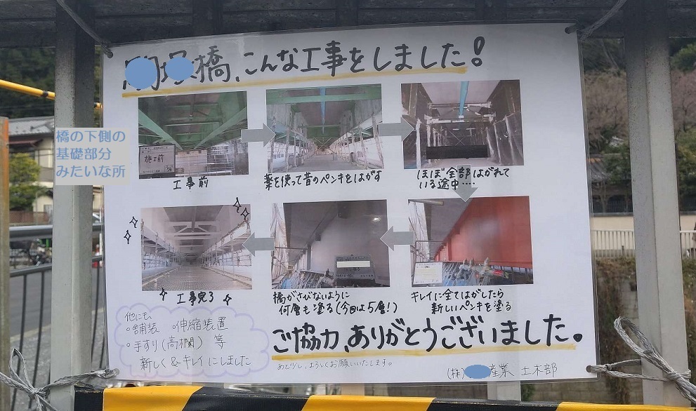 橋の上(道)より、基礎部分(下側)の改修のほうがメインの工事やったっぽい。
