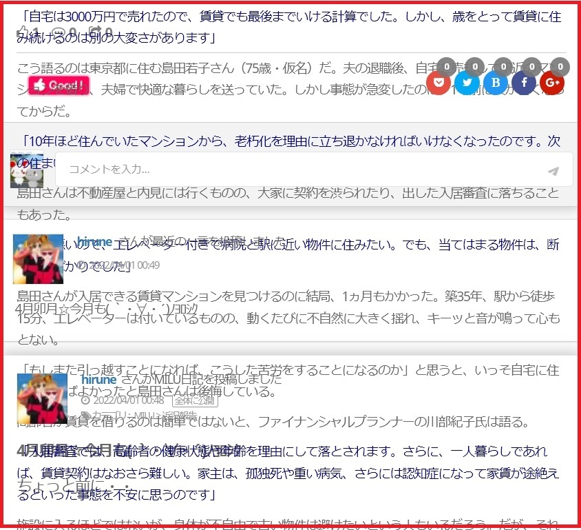 そうそう こういうHTMLのバグ起きるんですよ どっかのWEBページを そのまま ミル日記にコピペすると 最新のHTMLと最古のHTMLの差分で起きるんでしょうね~ よくわからないでしょうけど これは上の方の日記本文が 下のhiruneさんのコメントや日記に侵食を起こしてるって言う事なんです