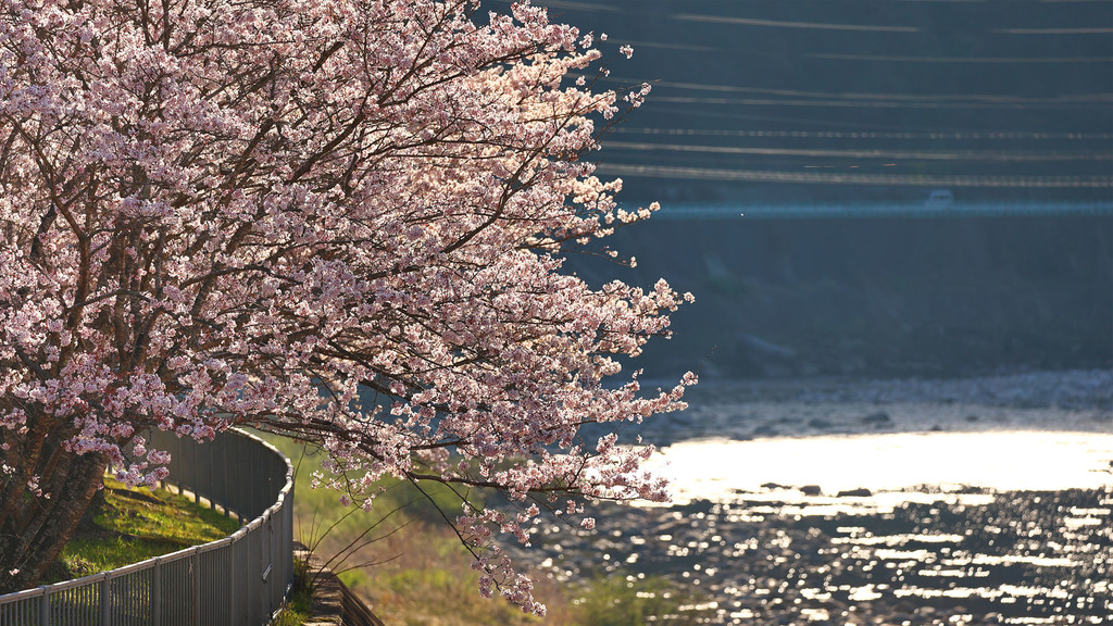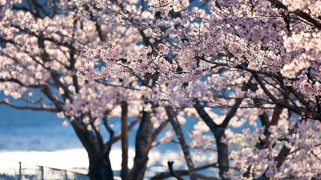 川と桜。 逆光で水面がキラキラしてるのを狙ってみた。