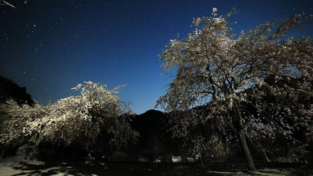 んで、これは1分間シャッター開けて撮った写真を約90枚重ねた画像です。空の線は星の軌跡。