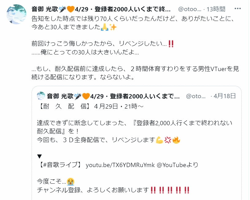 お友達のVtuberさんやリスナーさんの拡散などで昨日のうちに2000人到達したので、サムネも変更になり、