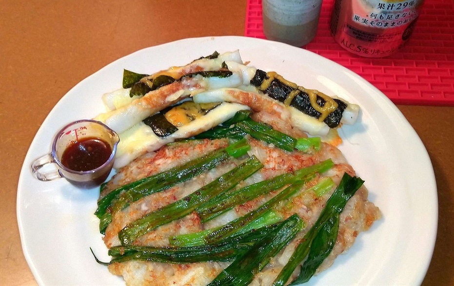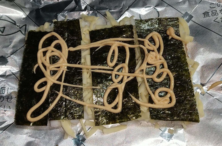 竹輪にチーズと海苔をのっけて、オーブントースターで焼いたのと