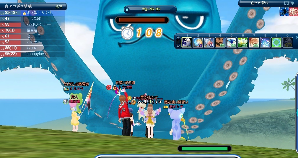 夕べフレさんからの要請で 青タコ本体撃破のPT長の大役を仰せつかった 今までの記録的な最速ボス出は 2投目 夕べは始まりは快調(かなり鈍調ではあったが) しかし 用事が出来たので抜けまーすと一人目・・・・嫌な予感 でも 緊急要請に 快くSnoopyloveさんが 助っ人参加 これで8人復帰 暫くして 1人が落ちた・・・回線?7人態勢(遅い・・・・) 更にあろうことか ちゅぴが落ちた・・・この時点でもう 何度か時間切れでタコ引けない・・・(*´Д`)=з 折角出来て来た ボス誘発の渦もリセットされてしまった・・・( ノД`)シクシク… 落ちた二人が戻って 投げ続ける事1時間 もう みんなにあきらめムードが・・・・・ でも ここで諦めたら負け 1時間以上の努力が無駄になる みんな 辛いだろうなー もう止めたいだろうなーと 思いつつも 冷酷に間髪入れず投げ続け 1時間10分 キタ━━━━(゚∀゚)━━━━!!