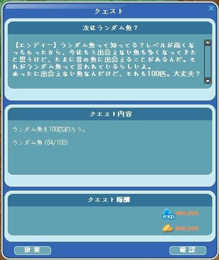 ランダム魚100釣りのクエですが、84匹釣りました (^_^)/ あと16匹になりました。