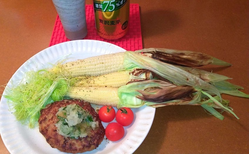 グリルで焼いて、冷蔵庫に残ってたハンバーグの付け合わせにしてみました