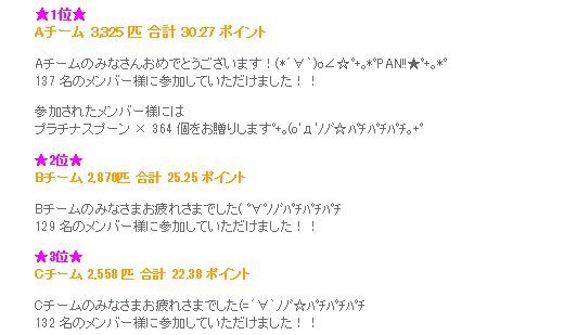 発表前に優勝の予感がすると言いましたが、見事はずれてCチームは最下位でした。