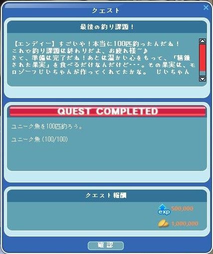ユニーク魚100釣りのクエが終了しました ヽ(^o^)丿