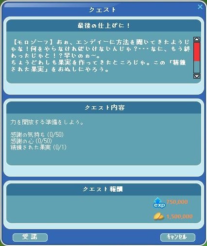 次のクエを貰いましたが、感謝の気持ち、感謝の心、精錬された果実の3種類でした。