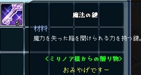 今日の貰いもの:ミリノアちゃん ヾ(●´ω`●)アリガト~♪ お部屋の鍵じゃないのね?((´∀`*))ヶラヶラ