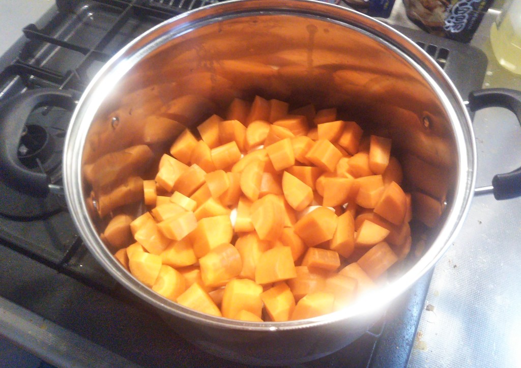 ばらばらばらーっと切った人参を鍋に投入して