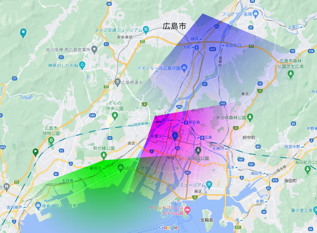 ブラウザで表示したGoogleMapの画面ハードコピーの上に自分で「こんくらいの範囲かなー?」ってエリアに扇形を自分で描いてます。なので、視点はほぼ合っているものの、範囲はかなり適当(笑) |