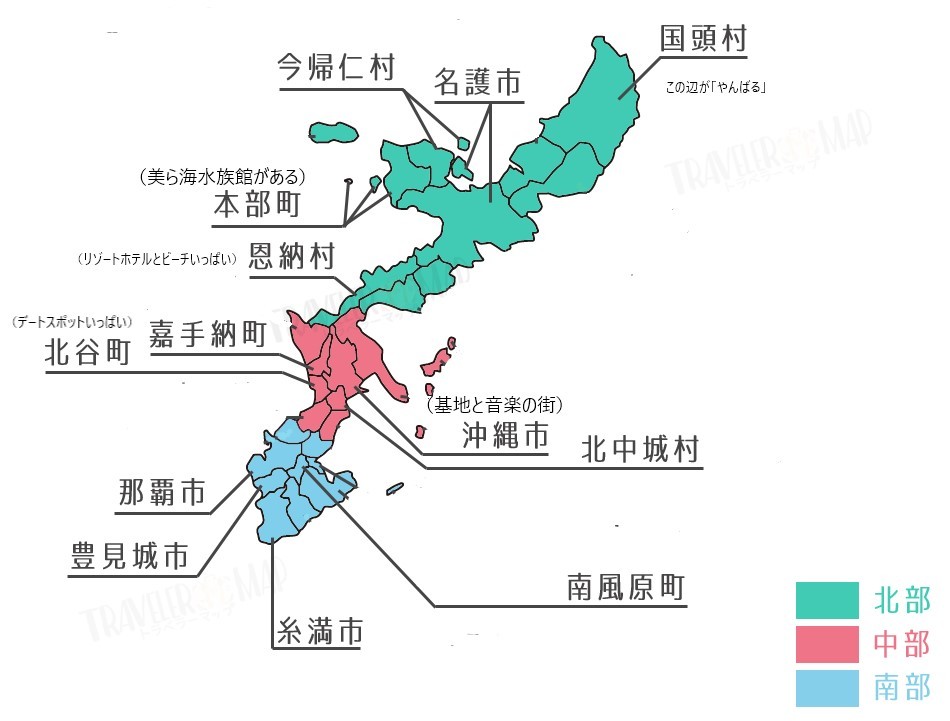 北は「きた」と読みますが本島中部、アメリカンビレッジがある