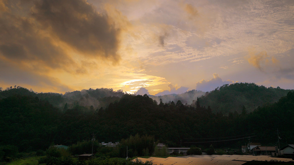 ヒメボタル撮りに車を走らせてて見かけた光景。 夕立のあと夕日に照らされてそこかしこから立ち上る靄。茜に染まり始めた空とそれを映すソーラーパネル。 こういうのってその場で見て「美しい」と思っても写真に写しこむのはむつかしいね。