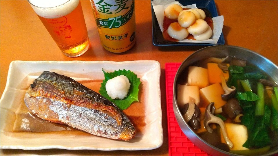 今日はカロリー控えめに、サバ焼いたのと湯豆腐みたいな鍋? スープにしました。