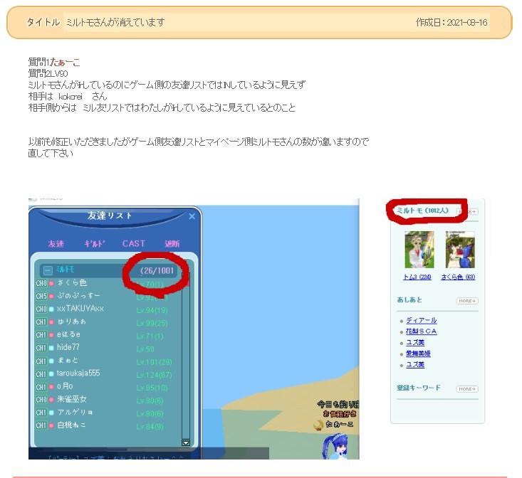 今だと ゲーム内1001人、マイページ側は1066と・・・・65人がミルトモさん切れてるw