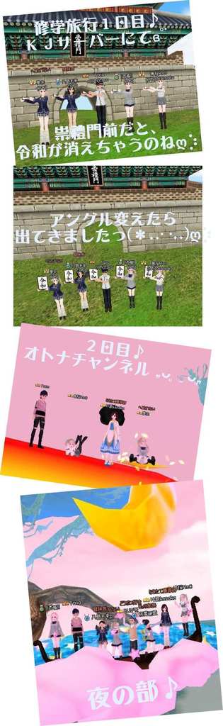 | 修学旅行3回行ったのかな?どれも楽しめたみたいで良いSS!(*^▽^*) もう終わっちゃったけど、また集まりたいねぇ(*´▽`*) |