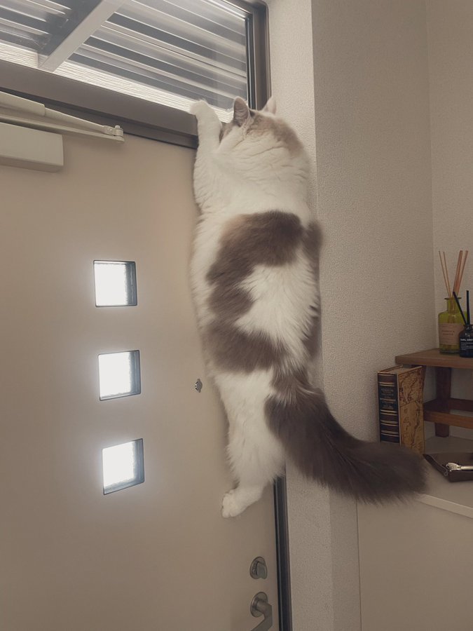 | ウチのお猫様もドア開けるのにドアノブで懸垂してたわ… |