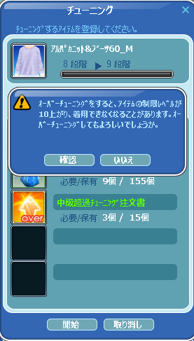 オーバーチューンで2回も着用できなくなってしまいましたwww、警告が出るのに何故クリックしちゃうんだろう?(笑)。 自Lvを超える場合は、自動で「本当にオーバーチューンしますか?」の様なダブル警告が 欲しいです~♪ |