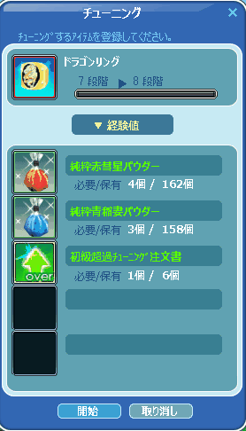 ドラゴンリングは初期値レベル40で レベル50~60まで オーバーチューニング済み 今回レベル70で最後のオーバーチューニングになります (初期値より3段階までオーバーチューニング可能です)