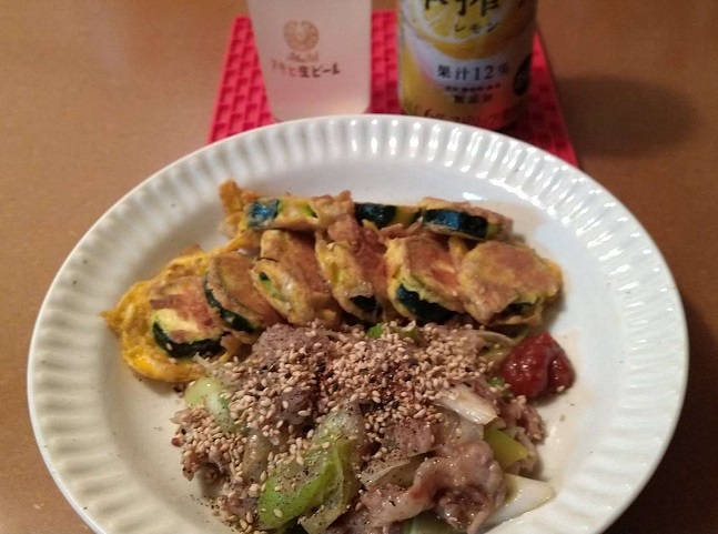 付け合わせ?主菜は豚肉とネギの炒めたもの(鰹節とゴマと胡椒と七味唐辛子ぶっかけ