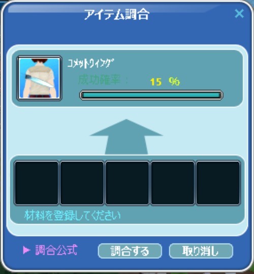 例の「ユニバースダンス★」のエモが付いてる着用アイテムを修繕可の調合(15%)には失敗しましたw