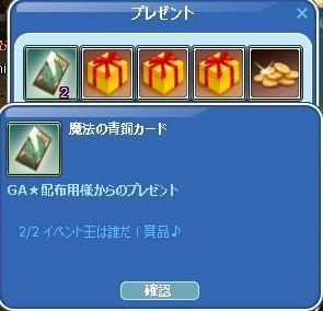 鬼は外~~~♪毎年恒例の我が家の節分行事(・`ω・)ゞデシッ!! さて、MILUでは~w イベ王のカードが届いてた♪ まだ初日の結果ですがw先日のレベアップで~やっと、新種のお魚が追加できたぜ☆なんと7ヶ月ぶりだったw暖かい所に生息してそうな・・お魚だね☆勿論~深海魚は呼ばないで、魚籠に仕舞いました(*´ω`*)