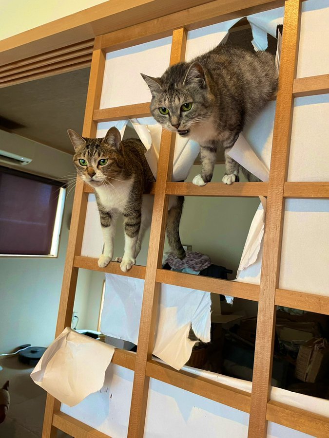 | 障子の張替えをお手伝いする猫ちゃんかなぁ?(ᵔᗜᵔ*)アハハ |
