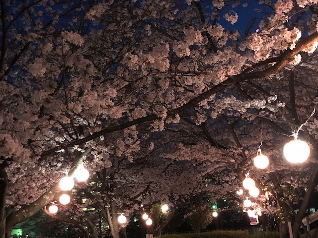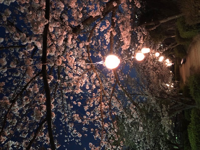 提灯に明かりが灯ると夜桜がとても綺麗でした