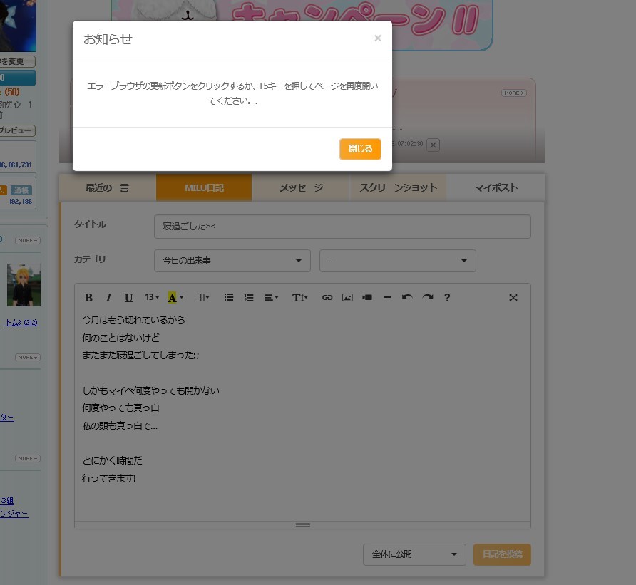 | 日記書いてそれが出ると やる気なくなりますね>< ウチはミルメも使えませんw何度問い合わせしても改善されないですね・・・ |