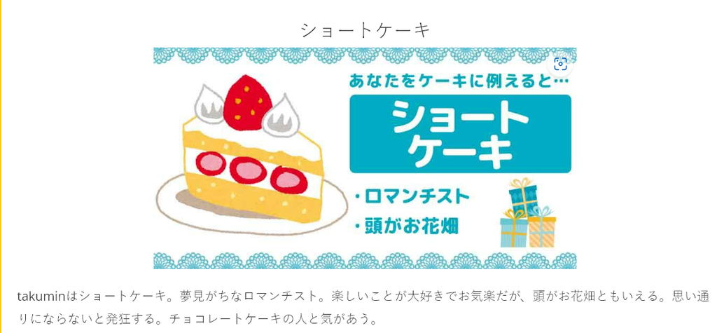 あなたはショートケーキ。夢見がちなロマンチスト。楽しいことが大好きでお気楽だが、頭がお花畑ともいえる。思い通りにならないと発狂する。ティラミスの人と相性がいい。